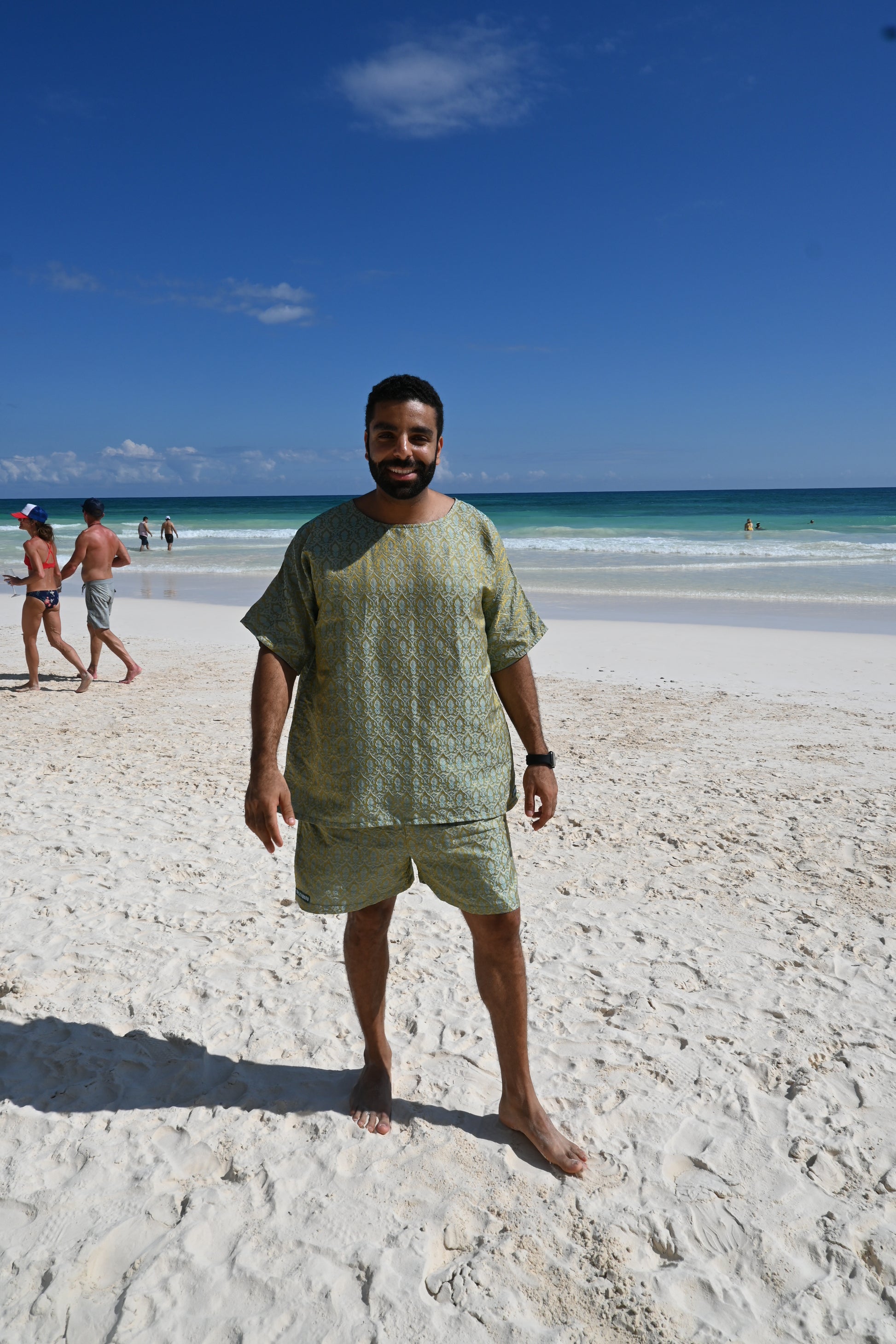 The Kih Set from the Onyx Collection is crafted from a refined blend of silk and brocade. Designed with a relaxed short-sleeve shirt and matching shorts, created for men who appreciate texture, movement, and understated luxury.
